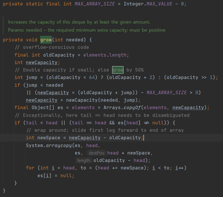 - 기존 용량이 64보다 작으면 기존용량 + jump(기존용량 + 2)로 늘려준다. 즉, 거의 2배로 늘려준다.