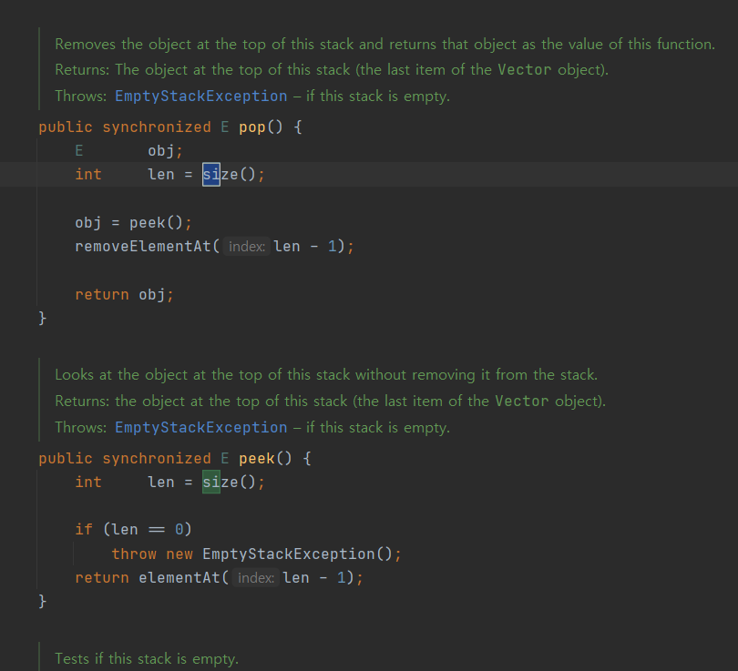 첫째, Stack의 내부를 보면 모든 메소드에 synchronized가 있기 때문에 단일 스레스 환경에서는 성능이 떨어진다.