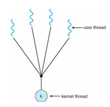 - 쓰레드 패키지를 사용자 영역에 두고 운영체제 커널은 단일 프로세스만을 관리한다.
