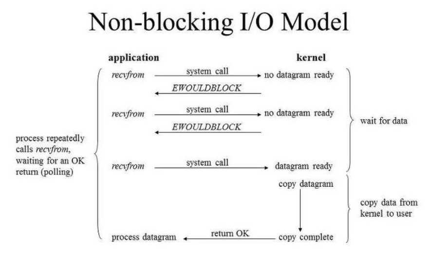 Non-Blocking I/O은 I/O작업을 진행하는 동안 쓰레드의 작업을 중단시키지 않는다. 쓰레드가 커널에게 I/O를 요청하는 함수를 호출하면, 함수는 I/O를 요청한 다음 진행상황과 상관없이 바로 결과를 반환한다.