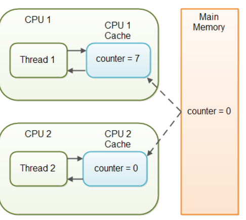 만일 counter 변수에 volatile 키워드가 없다면, counter 변수가 언제 CPU 캐시에서 메인 메모리로 쓰일지(written) 보장할 수 없습니다. CPU 캐시의 counter 변수와 메인 메모리의 counter 변수가 다른 값을 가질 수 있다는 것입니다.