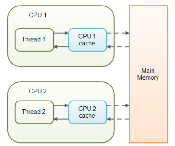 non-volatile 변수에 대한 작업은 JVM 이 메인 메모리로부터 CPU 캐시로 변수를 읽어들이거나, CPU 캐시로부터 메인 메모리에 데이터를 쓰거나 할 때에 대한 어떠한 보장도 하지 않습니다.