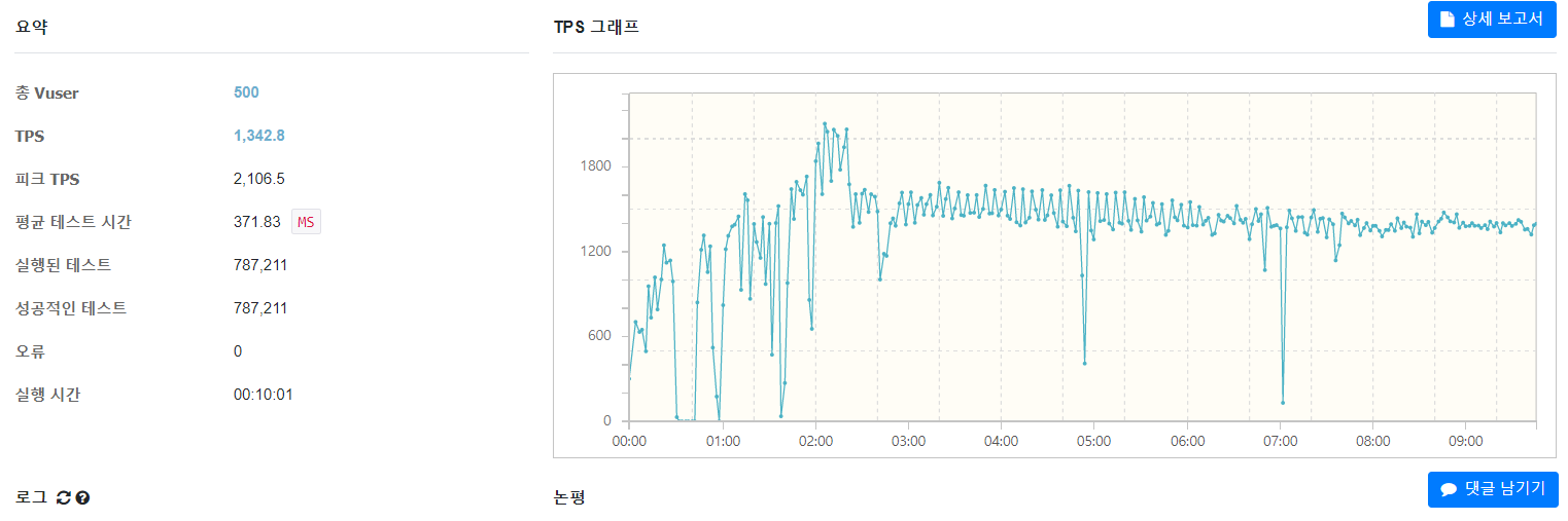 가상 접속자 1000명 기준으로 테스트 하였을때, 약 2700 TPS 처리량을 갖고, 테스트 요청당 230ms의 지연시간이 걸린다는 것을 알 수 있습니다. 오류는 0으로써 테스트는 100%의 성공률을 기록하였습니다.