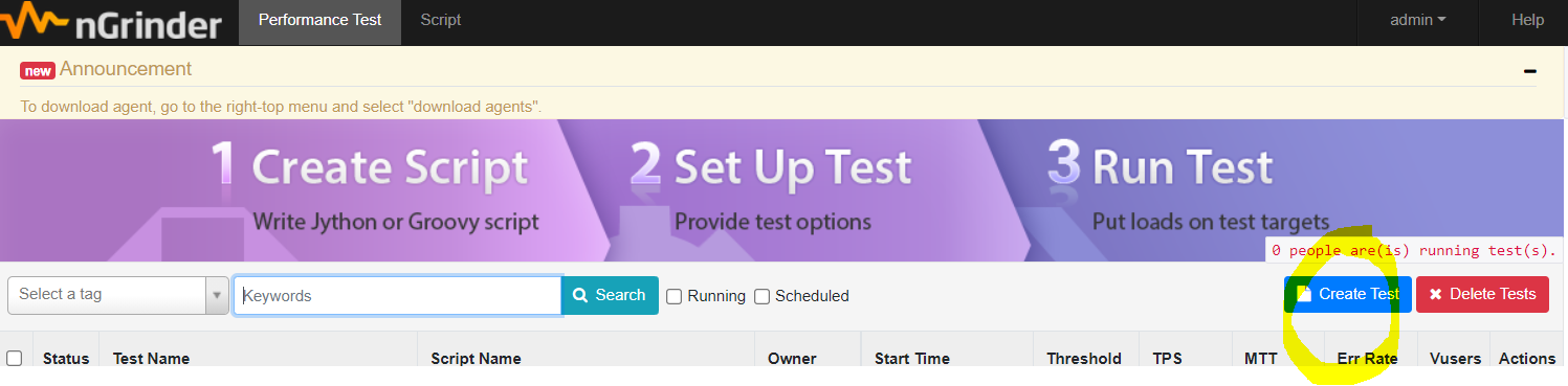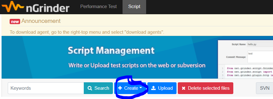 🔍 가장 먼저 성능테스트를 위한 스크립트를 작성해야 합니다. ngrinder 메인 화면에서 스크립트 생성 화면으로 이동합니다.