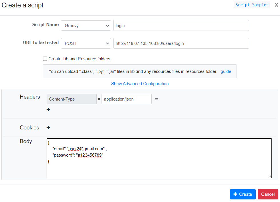 4. 스크립트문 작성이 완료되었으면 성능 테스트 페이지로 이동해 테스트 생성 버튼을 클릭합니다. 가장 먼저 로그인 테스트를 진행을 해보도록 하겠습니다