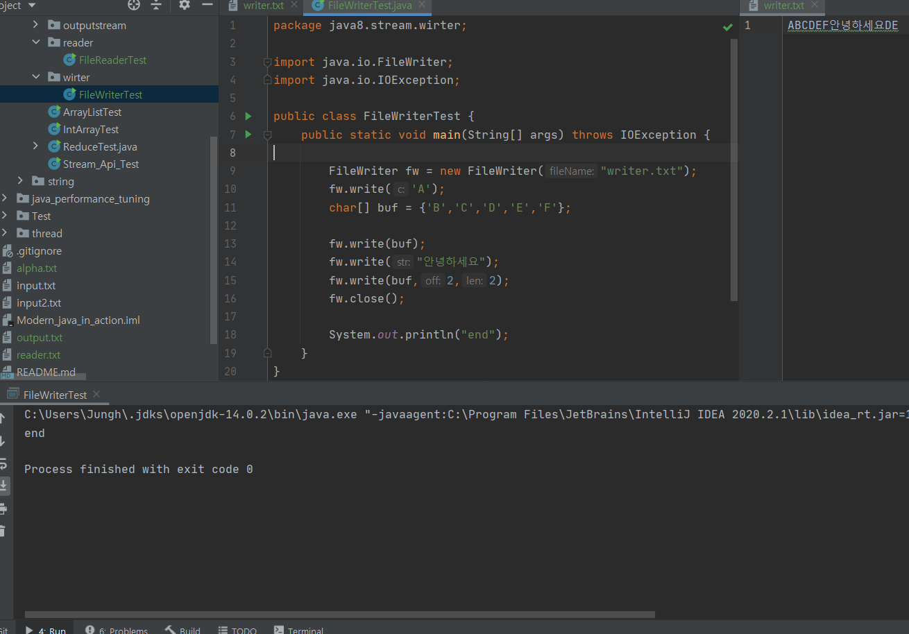 출력결과는 위와 같다. 이런 것이 보조스트림이고 데코레이터 패턴(데코레이터 패턴 글 참고)에 쓰인다.
