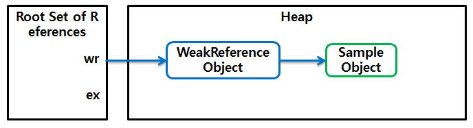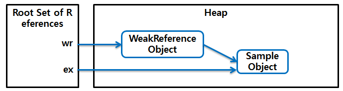 위 코드의 첫 번째 줄에서 생성한 WeakReference 클래스의 객체는 new() 메서드로 생성된 Sample 객체를 캡슐화한 객체이다. 참조된 Sample 객체는 두 번째 줄에서 get() 메서드를 통해 다른 참조에 대입된다. 이 시점에서는 WeakReference 객체 내의 참조와 ex 참조, 두 개의 참조가 처음 생성한 Sample 객체를 가리킨다.