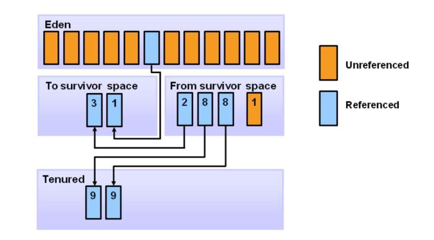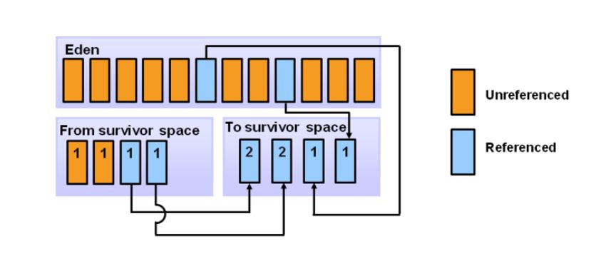4. 가비지 컬렉션이 수행되는 동안 첫번째 생존 공간의 객체들은 특정 임계값이 넘어가면 두번째 생존 공간으로 이동한다.