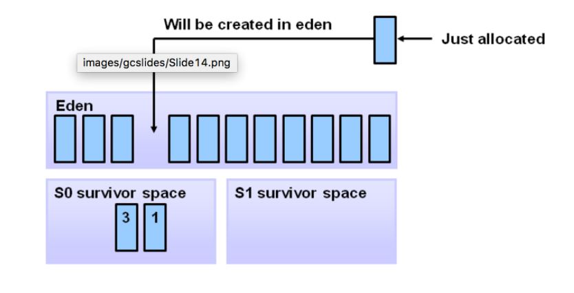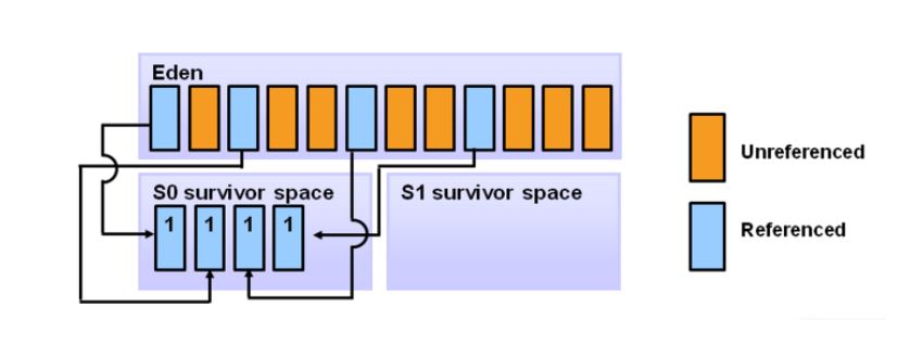 참조되는 오브젝트들은 첫 번째 survivor(S0)로 이동되어지고, 비 참조 객체는 Eden space가 clear 될 때 반환